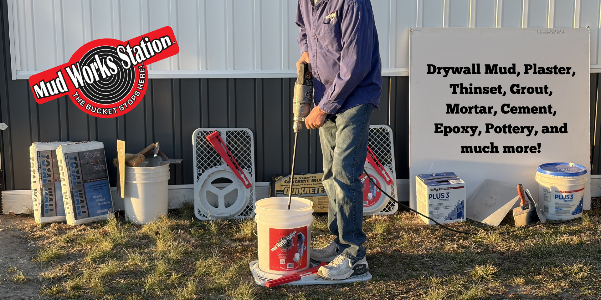 The Mud Works Station takes the fight out of mixing. Easier on your back, knees, and arms, it cuts mixing time in half and makes a two-person job a one-person breeze. Simple, tough, and easy to use, it’s the perfect tool for construction crews, carpenters, masons, DIYers, and anyone tired of wrestling with a spinning bucket.